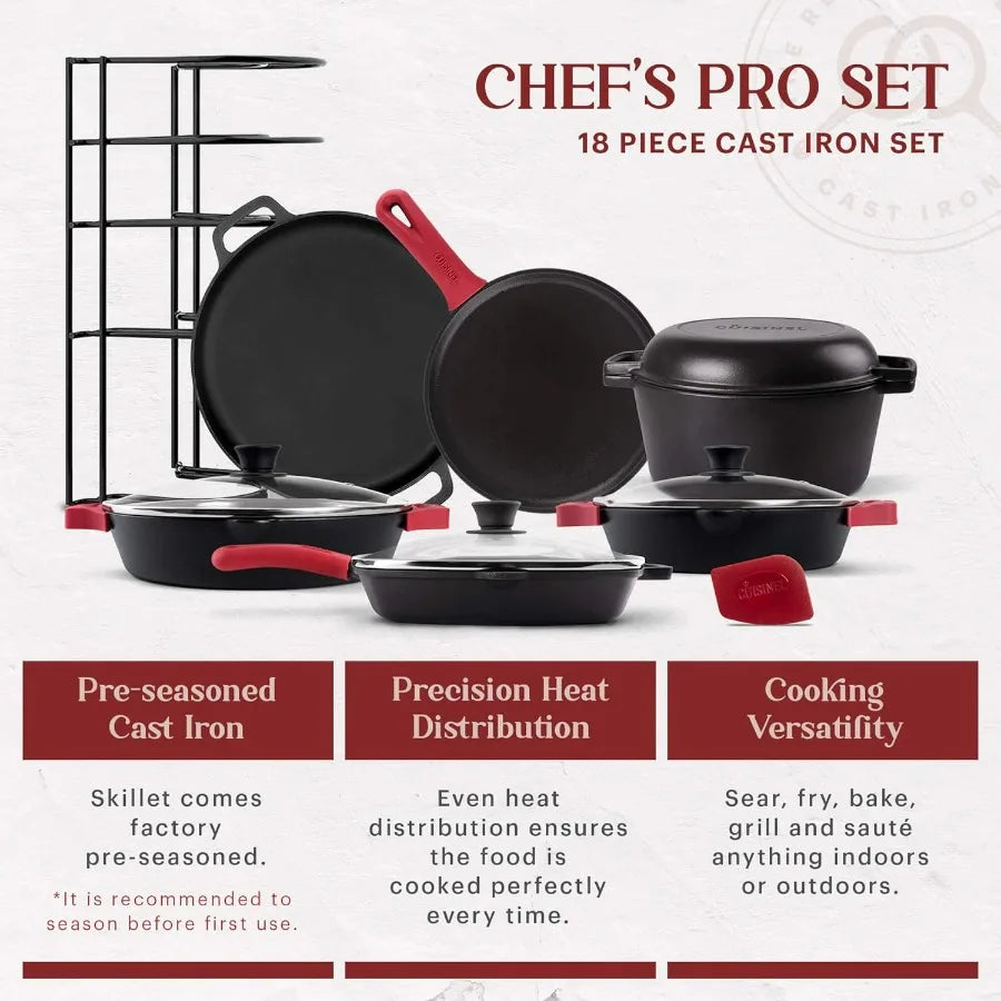 18-Piece Pre-Seasoned Cast Iron Cookware Set – Skillets, Dutch Oven, Grill Pan, Pizza Pan & Accessories